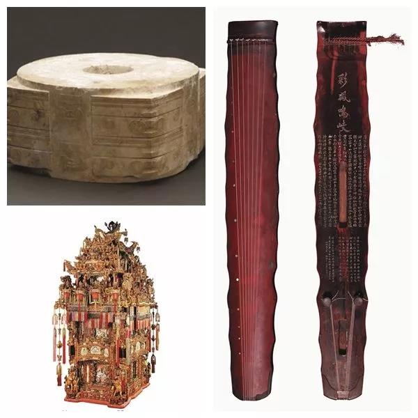 玉琮(左上)、宁波“万工轿”(左下)、落霞式“彩凤鸣岐”七弦琴(右)