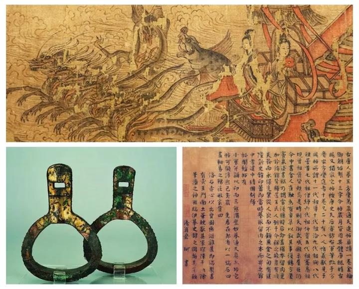 宋人摹顾恺之《洛神赋图》卷(上)、铜鎏金木芯马镫(左下)、唐摹王羲之一门书翰卷(右下)