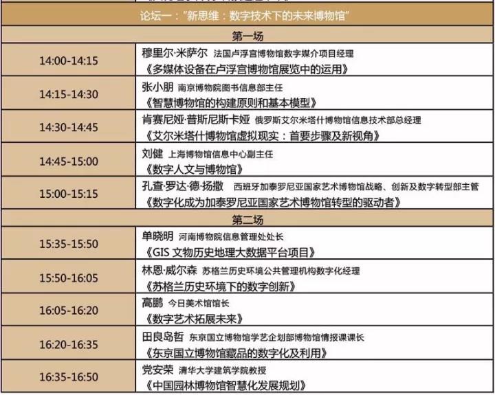 法国卢浮宫博物馆数字媒介项目经理穆里尔·米萨尔将介绍多媒体设备在卢浮宫博物馆展览中的运用,南京博物院图书信息部主任张小朋将就智慧博物馆的构建原则和基本模型展开探讨,俄罗斯艾尔米塔什博物馆信息技术部总经理肯赛尼娅·普斯尼斯卡娅则围绕艾尔米塔什博物馆的虚拟现实应用做相关讲解。