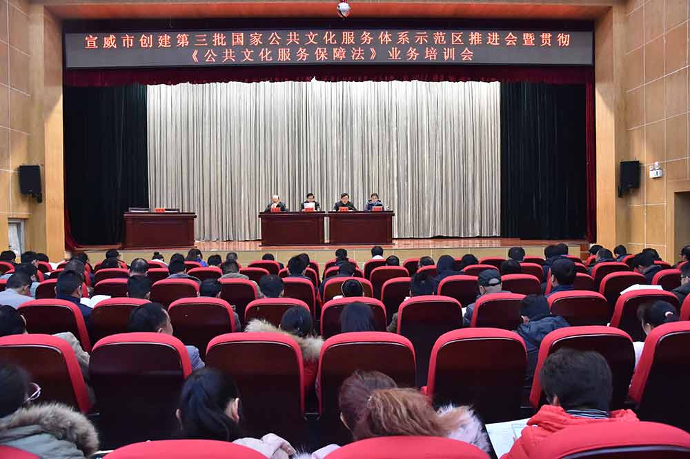 2017年12月5日至7日,宣威市创建第三批国家公共文化服务体系示范区推进会暨贯彻《公共文化服务保障法》业务培训会议在宣威市文化艺术中心二楼会议厅召开,市创建领导小组单位成员、各乡(镇、街道)分管领导、文广服务中心主任、市文体广旅局机关全体干部职工及所属单位班子成员参加了会议。会议主要任务是深入学习贯彻《公共文化服务保障法》,对创建国家公共文化服务体系示范区工作进行再部署、再安排、再推进,团结和动员全市广大干部群众,进一步认清形势、统一思想、提高认识,以改革创新的精神和扎实有效的措施,推进第三批国家公共文化服务示范区创建工作,为迎接国家检查组督查做好充分准备。会议上,宣威市副市长吕世宏、市文体育广旅局局长、创建办领导小组办公室主任余红梅先后作了重要讲话,市文体广旅局党委书记钱周祥辅导学习了《公共文化服务保障法》。