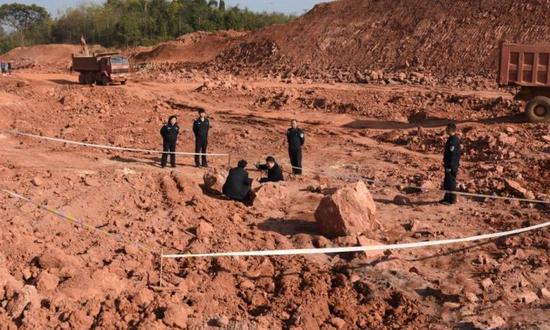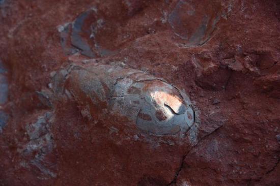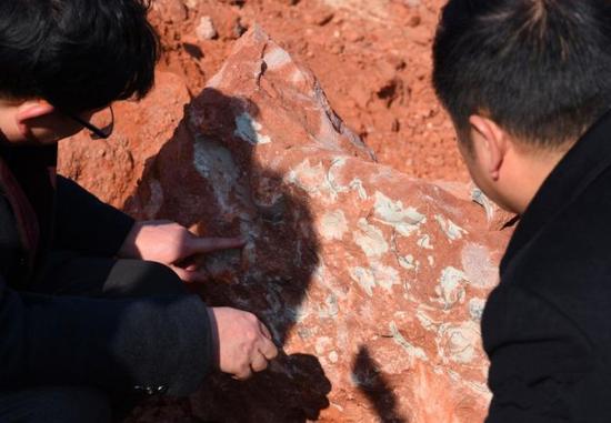 当天上午11时许,施工人员准备对爆破后的大石块进行分解时,发现石块中间嵌着一些椭圆形的石头和厚度约2毫米的黑色碎片,觉得很像恐龙蛋化石但又不能确定,于是立即报警求助。当地派出所民警赶到现场后,也认为石块内的镶嵌物疑似恐龙蛋化石,立即拉起警戒线保护现场并通知该县博物馆文物保护工作人员。