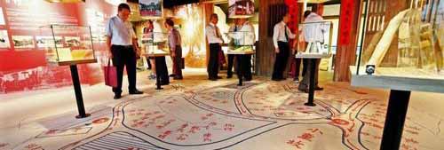 策展人将广惠肇碧山亭文物馆的地板贴上昔日甘榜山亭的地图,构思巧妙,展览也透过媒体、实物和照片方式呈现昔日甘榜山亭的生活。(新加坡《联合早报》/梁麒麟 摄)