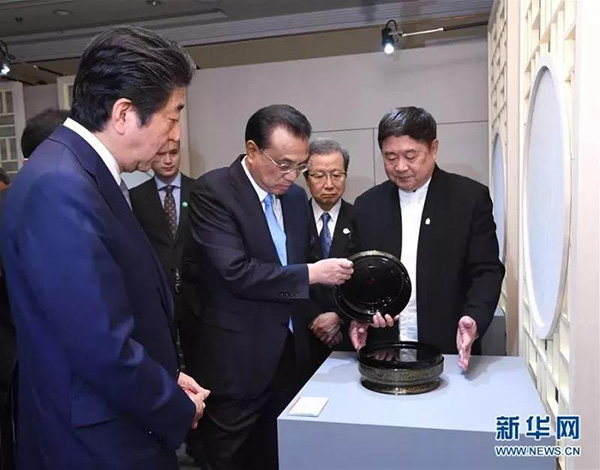 国务院总理李克强日本首相安倍晋三共同参观“让文物活起来——故宫文创展”:5月,该展览在东京举办。