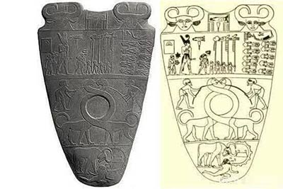 直到19世纪末,英国著名的历史学家詹姆斯·依斯瓦·魁贝尔在埃及南部发掘了一批祭祀美尼斯的文物,距今5100年。这批文物中,有一块遁形石板,考古学家给它命名为“纳尔迈调色板”。
