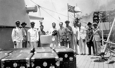 参加中国艺术英伦国际展览会的中英工作人员与英国海军重巡洋舰“萨福克”号舰长等合影(左四马衡,左五为郑天锡特派员,右二为庄尚严,右四为唐惜芬) 资料图片