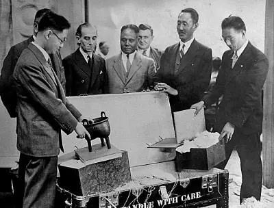 参加中国艺术英伦国际展览会的文物到达英国皇家艺术学院开箱的情形(从左至右:庄尚严,郑天挺特派员,大维德爵士,陈维诚参事,英海关关员,王景春博士,傅振伦) 资料图片