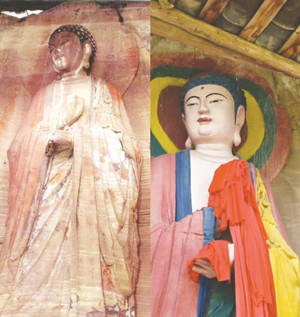 最近,四川安岳石窟佛像遭遇“浓妆艳抹”式修复的事件引起了社会广泛关注。图为佛像修复前后对比