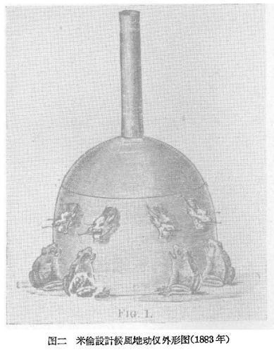此后,英国地震学家米伦也尝试了对地动仪的复原。在1883年出版的《地震及其他地动》一书中,收录了他对地动仪的复原图式。他的设计采用悬垂法,并将悬摆突出到仪体外端。