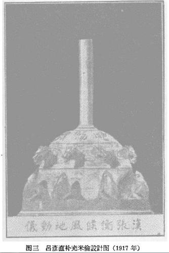 而中国近代可考的对地动仪的复原,始于建筑师吕彦直在1917年发表的设计图。从图式来看,其复原的地动仪基本与米伦所复原的式样相同,只是对其艺术装饰和部分结构进行了补充。