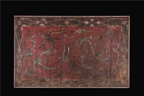 马萧林:我想推荐的是四神云气图壁画。这幅壁画1986年出土于河南永城芒砀山西汉梁王墓的墓顶,长5.22米,宽3.23米。壁画上绘制了一条蜿蜒长达5米的巨龙,长舌卷一怪兽,昂首张口,疾驰云中;青龙腹部西侧绘一白虎,前足攀神树,后足踏彩云;青龙腹部东侧绘一朱雀,身材修长,口衔龙角;龙口中的怪兽为鸟头、蛇身、鱼尾。