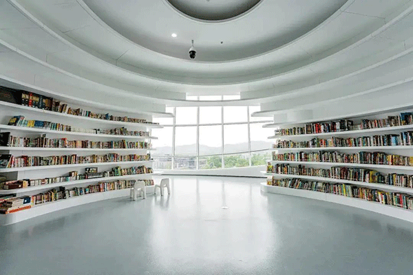 三楼除了展厅,还有造型别致的图书馆,可以坐在这里看看书,欣赏一下窗外白马湖公园美丽的景色。