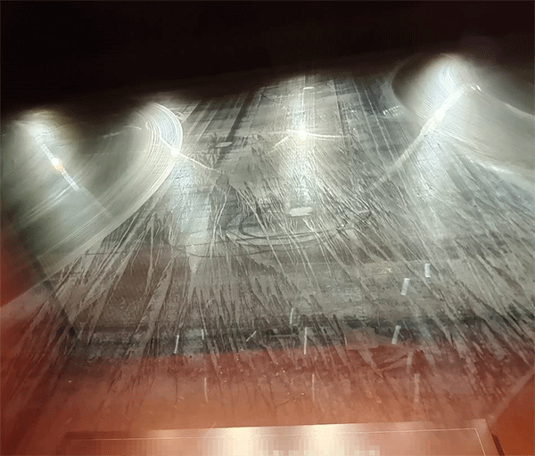 由于大雨,导致展厅内湿度过高,如果展柜密封不严,柜内湿度也会因此偏大,此时玻璃内表面出现平时没有发生过的结雾现象,会将玻璃表面各种不均匀的印记凸显出来。