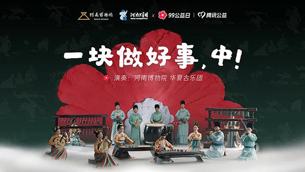 河南博物院华夏古乐团通过“文化+公益”的方式,将现代流行音乐与华夏古乐器的雅乐风格相结合,使用了包括先秦时期的钟鼓磬瑟、汉唐时期的阮筝琵琶等13件传统古乐器,将公益歌曲《一块做好事》进行了重新演绎。