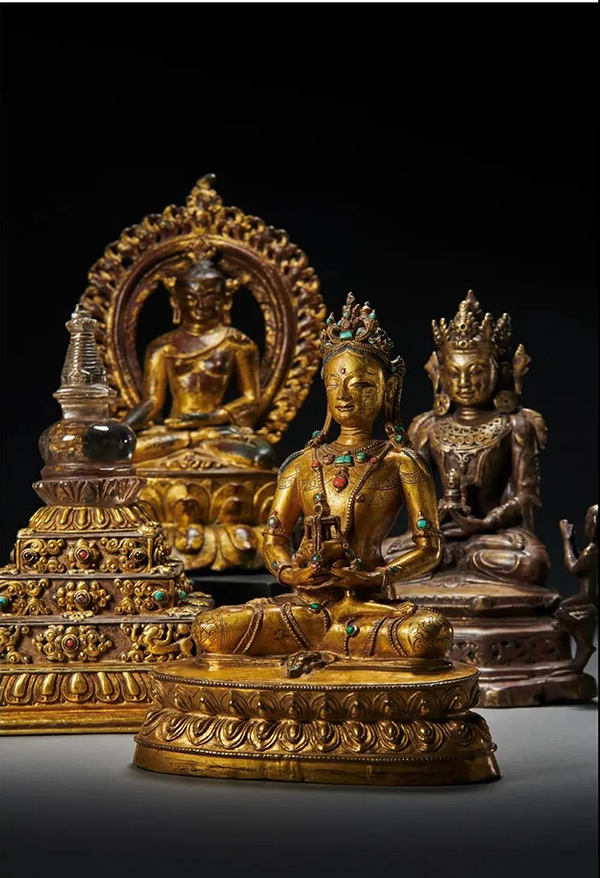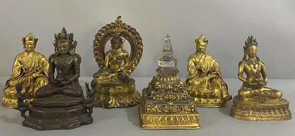其中,5件金铜佛造像和1件铜鎏金水晶嵌宝石供养塔制作工艺精良,专家建议暂定为三级文物。特别是1尊明末清初的黄铜同侍从无量寿佛造像,呈现出显著汉藏融合风格,其六面形台座多见于汉藏风格唐卡与壁画,在铜造像中较为罕见。