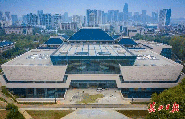 新馆总建筑面积6.4万平方米,主体建筑文物展览大楼为“鼎”字造型。从南侧高处远眺新馆与老馆,其间暗藏玄机,整体造型如同“楚屈子赤角簠(fǔ)”。新馆和老馆屋檐的三个檐口,像簠一样严丝合缝地叠在一起,似三个大屋檐“扣”在新馆鼎字型屋顶上。