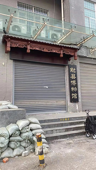 乍一看,勉县博物馆的大门就像一处城镇大街上的普通店门。卷闸门贴着窄小的入口,上方有仿古的额枋。仿古门额仿佛在竭力诉说它的身份:它既有崇古之意,也有当代功能;它不是个普通的小店,而是要展示这座古城重要的一段历史,却不幸淹没于一长串的临街店铺之中毫不起眼。
