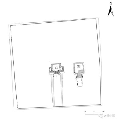 M1、M2上的土墩近方形,东西长49米,南北宽48米。土墩打破生土后,铺垫一层0.1~0.3米纯净细腻灰白土垫土,形成较为平坦的底面,然后在其上夯筑土墩,夯土为黄粘土夹灰白土,夯层致密、平直,夯层厚0.05~0.15米,夯土之上的封土因被后期破坏,情况不明。M1在土墩的中心挖浅穴、修砖室,同时堆筑夯土,并预留墓道,下葬封门后在墓道内填土,最后封土形成土墩。M1位于土墩中心,而M2偏于土墩东南隅,墓圹打破土墩,是开挖土墩营建的,说明M2晚于M1。