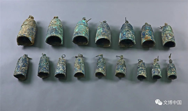 M2随葬文物丰富,清理出陶器、瓷器、铜器、漆木器、铁器、玉器等600余件(套)。其中陶器有灰陶罐、炉、钵、灯、磨、几等;灰陶俑有牛、马、猪、狗、鸡、骆驼等动物俑、双人首蛇身俑、执盾武士俑、文吏俑等;铜器有铜编钟一套(16件)、铜编磬一套(20件)、凤冠1组、铜灯10件、铜豆等;还有青釉辟雍瓷砚和白玉璋各1件。青铜编钟、编磬是迄今国内唯一的隋唐时期的实物。