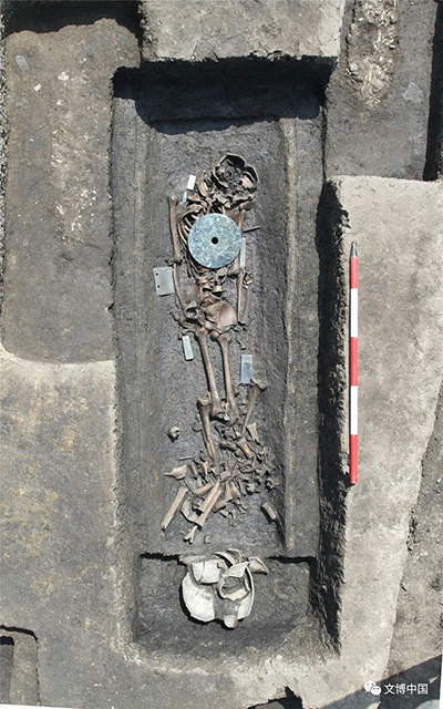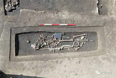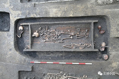 M116为烧骨二次葬,经焚烧过后的骨骼按墓坑方向东西向集中摆放,整体呈长条形,系异地焚烧后入葬。