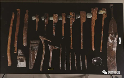 木器100多件,保存优良,器形有桨、器柄、带销钉木器、矛形器、点种棒、双尖头木棍、单尖头木棍、杵、碗、扁担形木器等,其中数量最多、加工最特殊的是挖凿有规整椭圆形卯孔的“刀”形器柄,推测它们应是与石斧组装使用的木工工具。