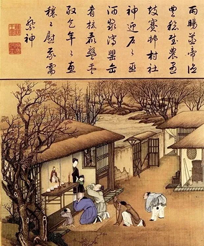 ▲南宋·楼俦《耕织图》摹本(局部)祭祖的场景