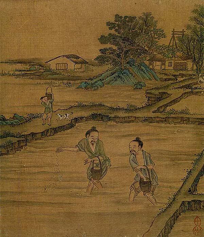 ▲明 仇英《春耕图》 册页 (局部) 绢本设色