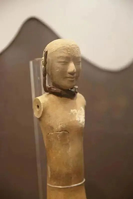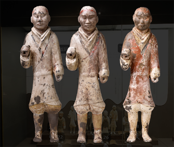 这次展出的霸陵半塑陶俑,它的颈部戴一刑具“铁钳”,通俗地叫“刑徒俑”,这与汉景帝阳陵刑徒墓地出土骸骨两相参照,印证了汉代帝陵修建使用服刑人员作为重要劳动力的历史事实。半裸半塑的做法,很可能是汉初全塑陶俑与景帝阳陵全裸着衣式陶俑之间的发展过渡,弥补了两类陶俑之间发展演变的缺环,具有重要的研究价值。