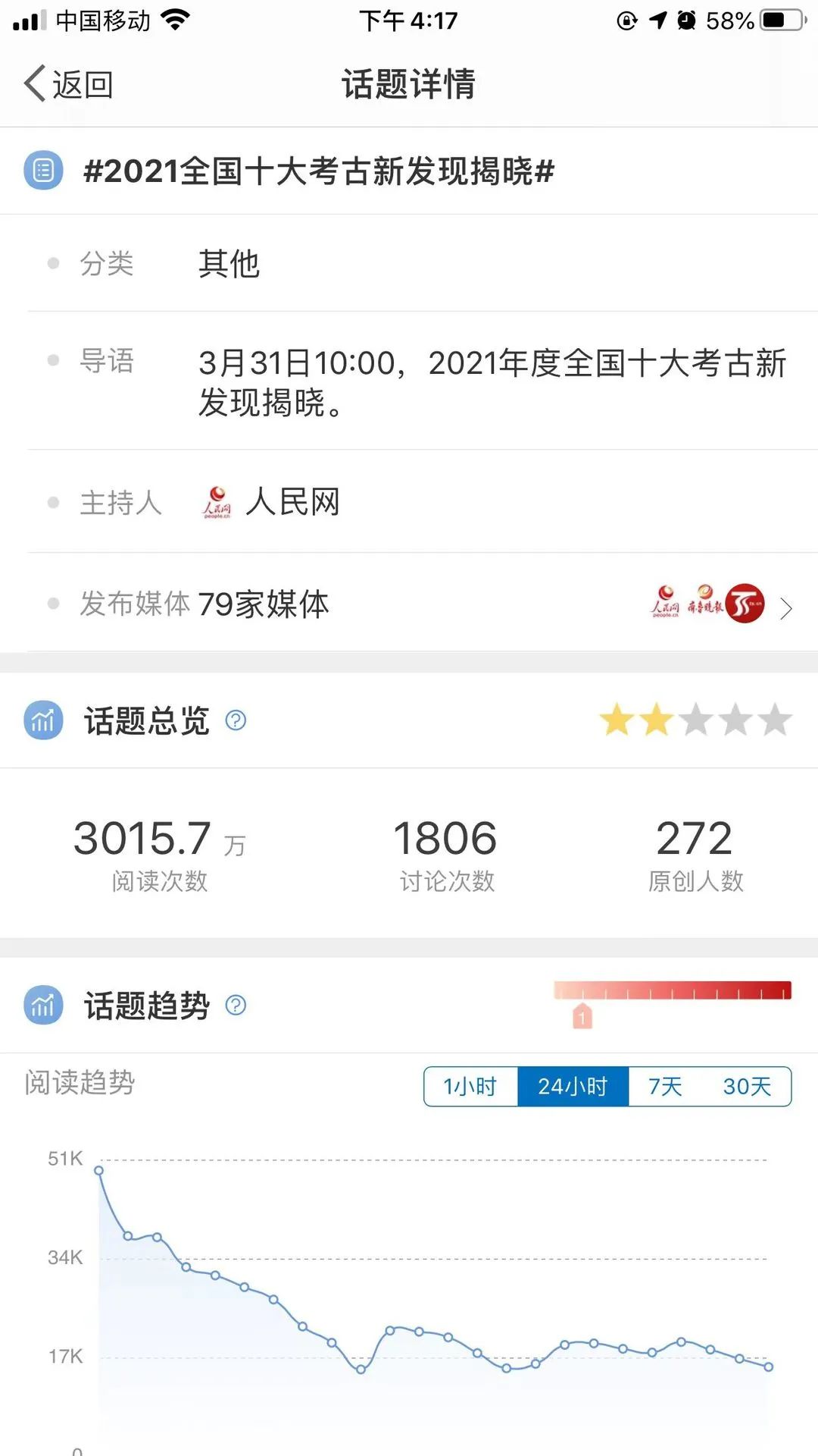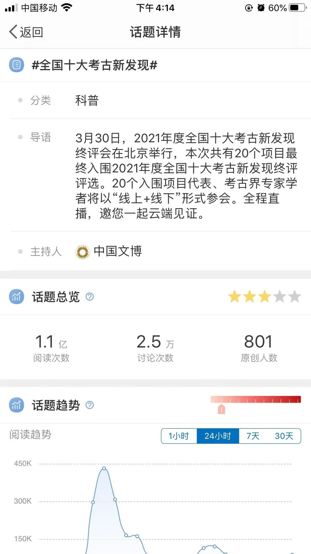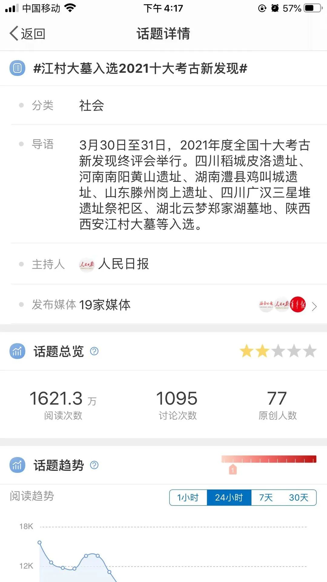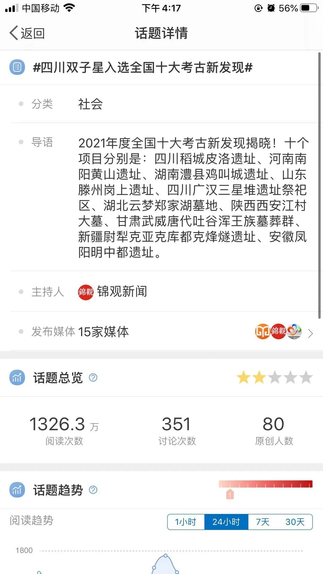 直播的同时,也带动了以微博话题、头条专题为代表的千万级阅读量。2021年度全国十大考古新发现话题在直播期间、结果揭晓后持续发酵,阅读量和互动量不断增长。新浪微博上,有关2021年度全国十大考古新发现的话题共有60余个,其中阅读量超过1000万的有8个,如@中国文博 发起的话题#全国十大考古新发现# 阅读量1.1亿、@人民网 发起的话题#2021全国十大考古新发现揭晓# 阅读量3015万、@人民日报 发起的话题#详解2021全国考古十大新发现#话题阅读量1625.7万、@央视新闻 发起的话题#三星堆等入选2021十大考古新发现# 阅读量1120万,粗略统计话题总阅读量超过4.8亿。