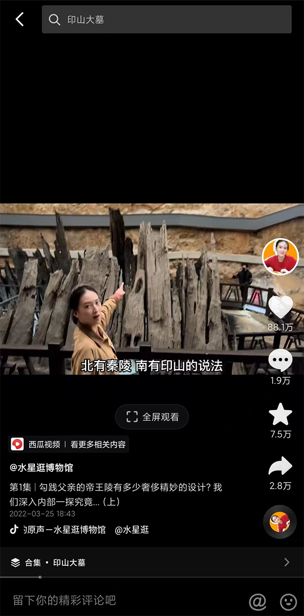 水星就想为公众科普考古,于是2020年9月,抖音上多了一个叫「水星逛博物馆」的账号。至今,有164万人关注了这个95后女孩,这个面目清秀的女孩带领观众钻入帝王陵,探秘火坑墓,参观潜水艇。