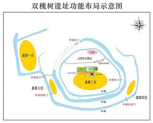 遗址内发现有4处公共墓地。勘探确认墓葬总数1700余座,均呈排状分布。在墓葬区发现夯土祭坛遗迹3处。