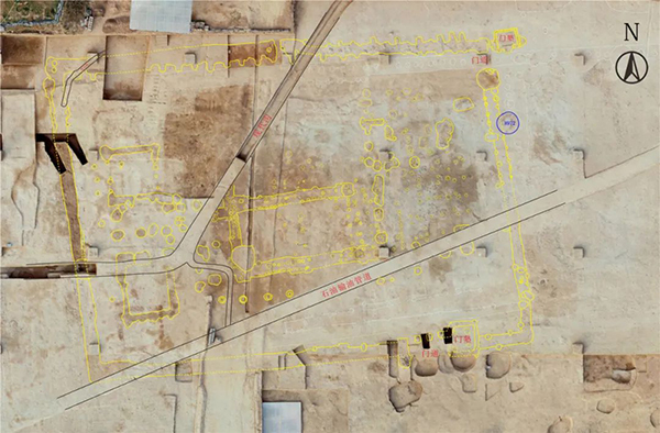 二号院落 平面呈长方形,院墙面积1500多平方米。院墙基槽通过夯筑而成,墙中发现具有承重作用木柱,墙体内外侧发现有扶壁柱和扶壁墙。发现有门道及门塾遗迹,院落南墙偏东位置发现有“一门三道”的门道遗迹。院落内发现大型建筑基址,整体结构布局尚不清晰。目前判断院落年代为遗址四期早段。